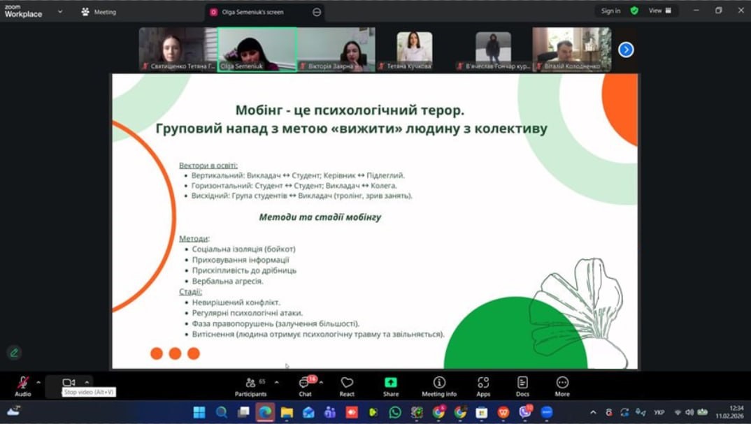 11 лютого 2026 року в університеті відбувся онлайн-семінар, присвячений актуальній проблемі запобігання булінгу та створення безпечного освітнього середовища. Захід було проведено в межах кураторської роботи з метою підвищення рівня обізнаності кураторів і старост щодо питань протидії цькуванню в студентських колективах.