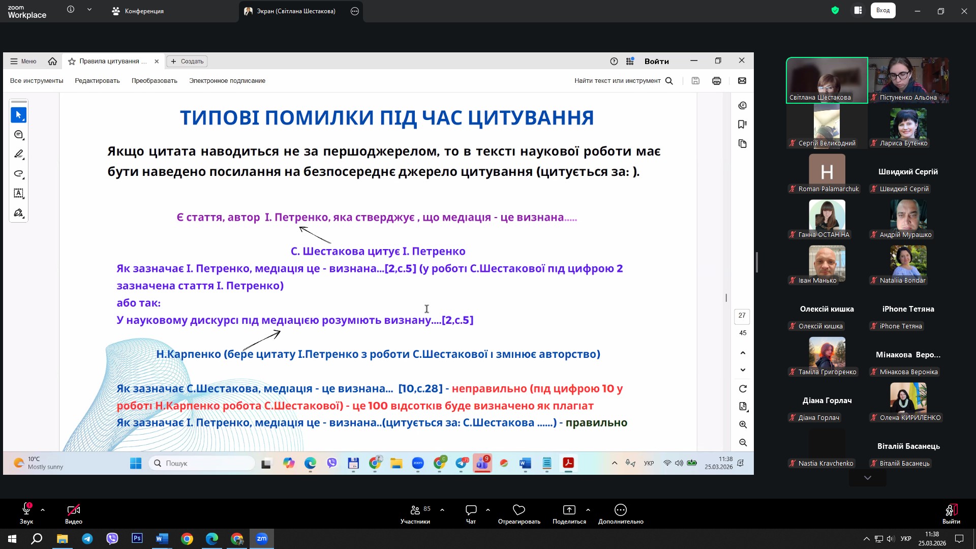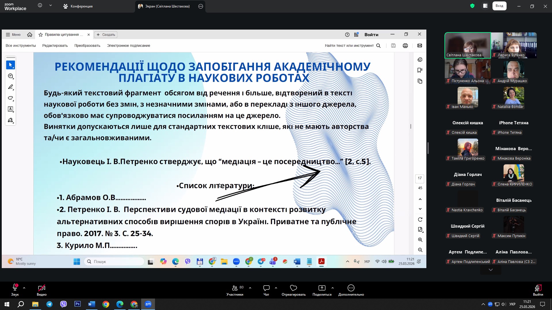 Під час лекції пані Світлана розповіла про поняття плагіату, його види та наслідки, а також про правила оформлення цитат у наукових текстах. Було розглянуто різні стилі цитування, пряме та опосередковане цитування, а також практичні поради щодо поєднання власних ідей з чужими та використання онлайн-сервісів для перевірки текстів на плагіат.