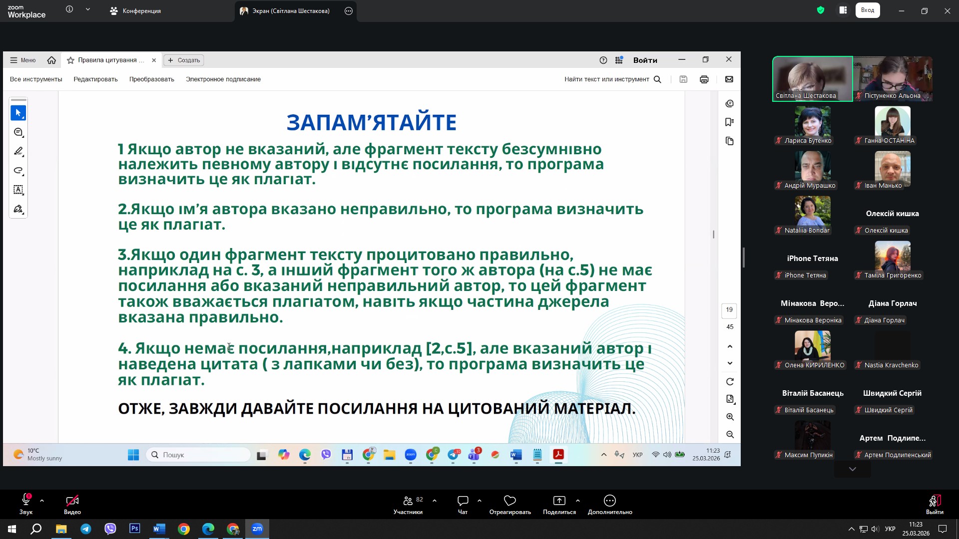 Щиро дякуємо Світлані Олександрівні за змістовну лекцію, практичні поради та цікаву дискусію, яка допомогла студентам і викладачам краще зрозуміти правила цитування та важливість уникнення плагіату у науковій діяльності.
