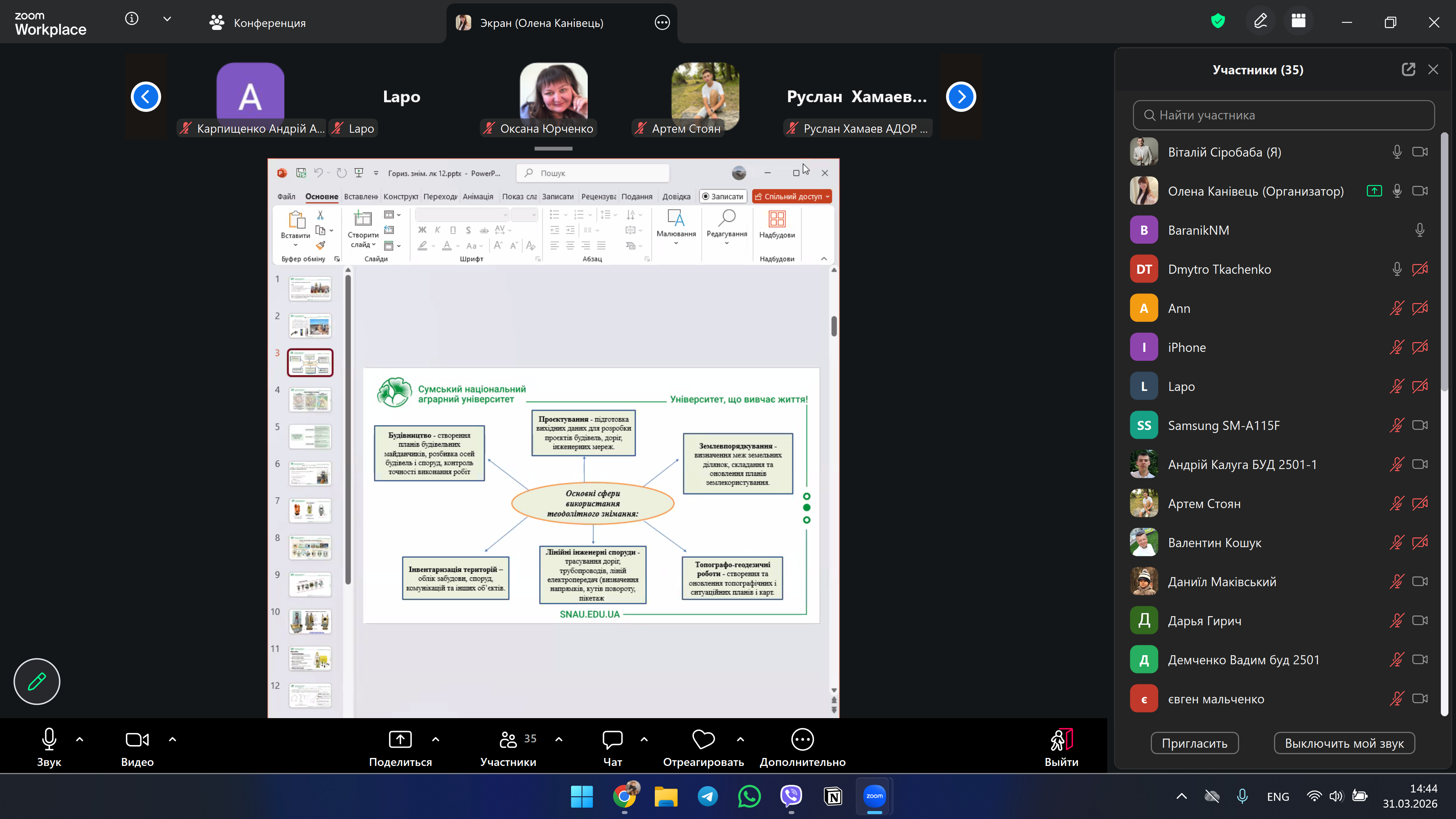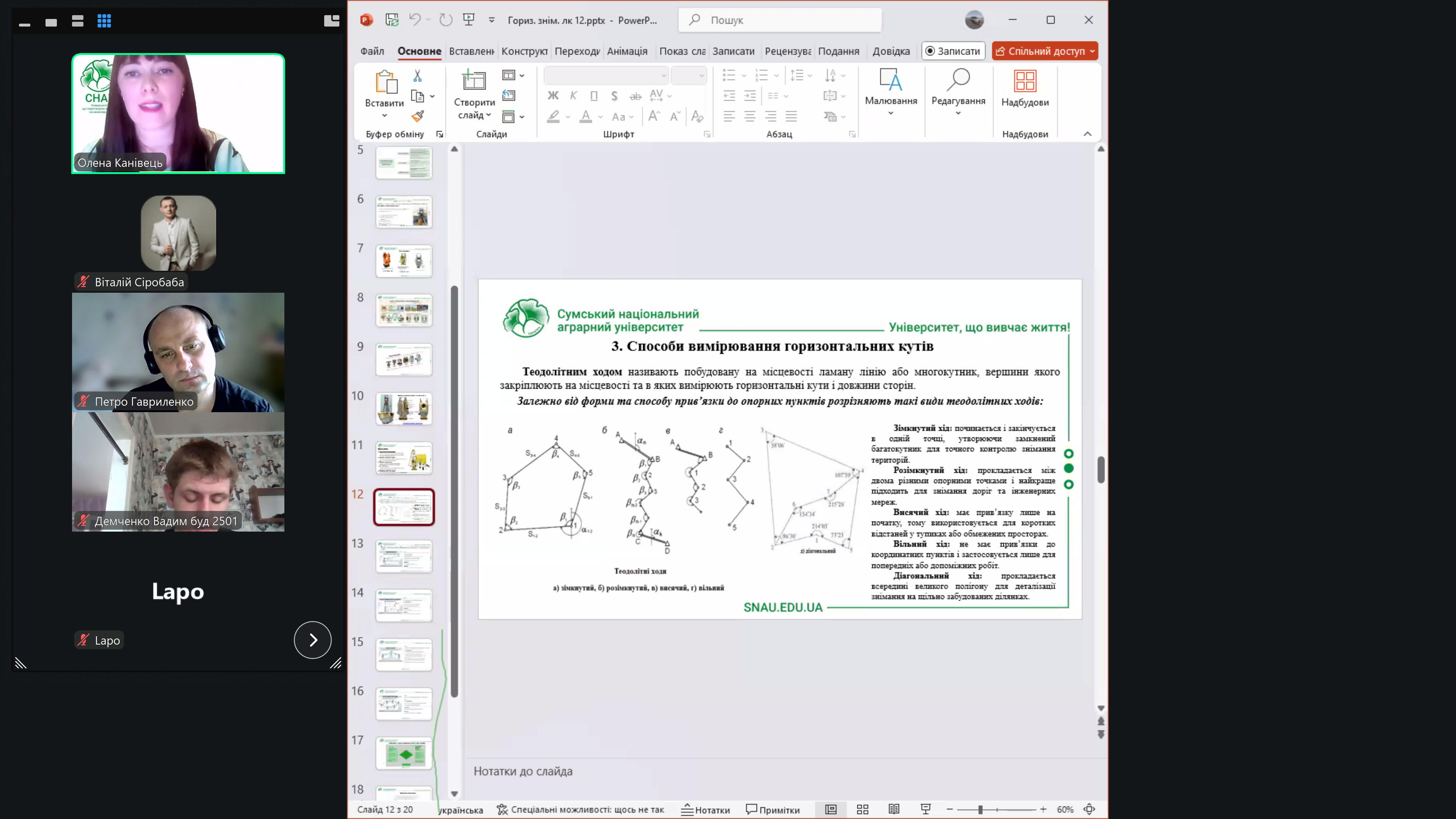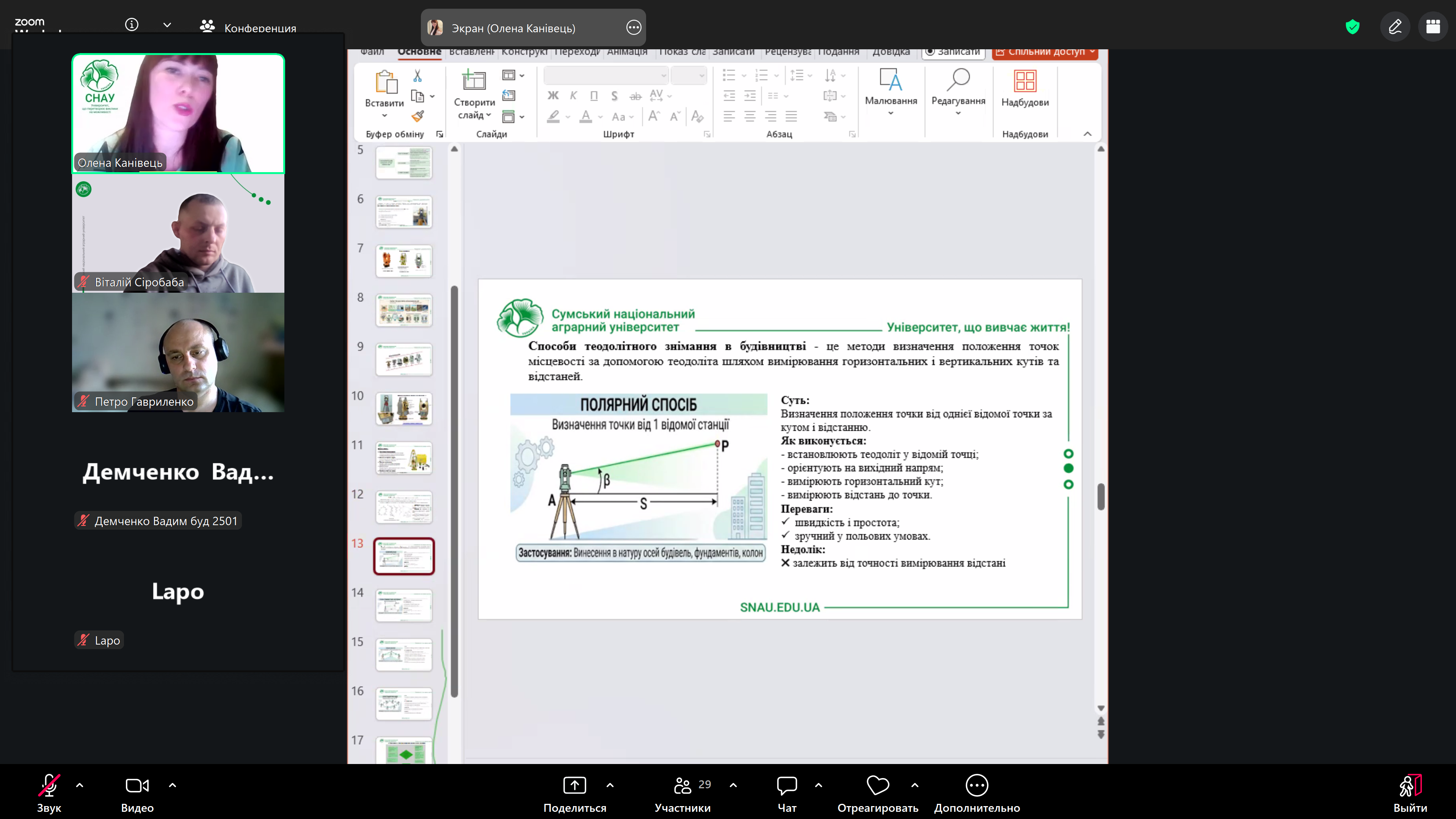 Лекторка доповіла про теоретичні та практичні основи горизонтальної зйомки місцевості, зокрема розкрила сутність теодолітного знімання як базового методу визначення планового положення точок у будівництві. Було охарактеризовано будову, види та принцип роботи теодолітів, а також розглянуто основні способи вимірювання горизонтальних кутів і виконання знімання на будівельному майданчику. Окрему увагу приділено етапам виконання робіт – від підготовчих і польових до камеральної обробки результатів, включаючи обчислення координат, оцінку точності та усунення похибок вимірювань.
